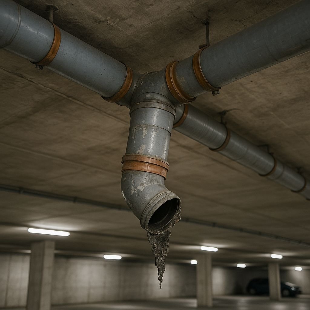 Un saneamiento descolgado en un garaje se produce cuando las tuberías de evacuación o conducción de aguas residuales, situadas en la parte superior del espacio, pierden su correcta sujeción o presentan daños estructurales. Esto puede deberse a: